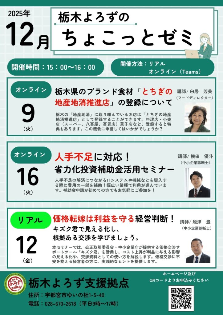栃木よろずの「ちょこっとゼミ」12月開催のご案内 投稿日: 2025年11月5日2025年11月5日 投稿者: tochigiyorozu 栃木県よろず支援拠点では、様々なテーマについて「ちょこっとゼミ」開催しています。 どなたでも無料でご参加できますので、お気軽にご参加ください。 【参加費】無料 【定員】10名程度(先着順) 【申込締切】各セミナー開催日の3日前 以下のフォームに必要項目をご入力の上、「送信する」ボタンをおしてください。 受講希望セミナー (必須) —以下から選択してください—11/19(水)「ほぼ0円で売上最大化を狙え!手法42選を伝授する飲食・サービス業向けセミナー」(リアル)11/27(木)座談会「今、どこにいる?」~事業の“もやもや”を言葉にし、明日への道を探る(リアル)12/9(火)栃木県のブランド食材「とちぎの地産地消推進店」の登録について(オンライン)12/16(火)人手不足に対応!省力化投資補助金活用セミナー(オンライン)12/19(金)価格転嫁は利益を守る経営判断!キズク君で見える化し、根拠ある交渉を学びましょう。(リアル) 参加者氏名 (必須) 年齢 (必須) —以下から選択してください—10代20代30代40代50代60代70代80代その他 会社名 又は 屋号 (個人の方は記載不要) 法人番号 (法人のみ記載) 業種・事業内容 (個人の方は記載不要) 郵便番号 (必須) 住所 (必須) 電話番号 (必須) メールアドレス (必須) セミナーは何で知りましたか? (必須) —以下から選択してください—よろず支援拠点ホームページよろず支援拠点Facebookよろず支援拠点Twitterよろず支援拠点コーディネーターからの案内メルマガ知人からの紹介その他 これまでによろず支援拠点に相談したことはありますか? (必須) —以下から選択してください—あるない ご利用にあたりまして、留意事項をあらかじめご了承ください。 (必須) →ご利用にあたっての留意事項はこちら 同意する このサイトはreCAPTCHAによって保護されており、Googleのプライバシーポリシーと利用規約が適用されます。 Δ 【お問合せ先】 栃木県よろず支援拠点 電話:028-670-2618 ※受付時間:平日9時~17時