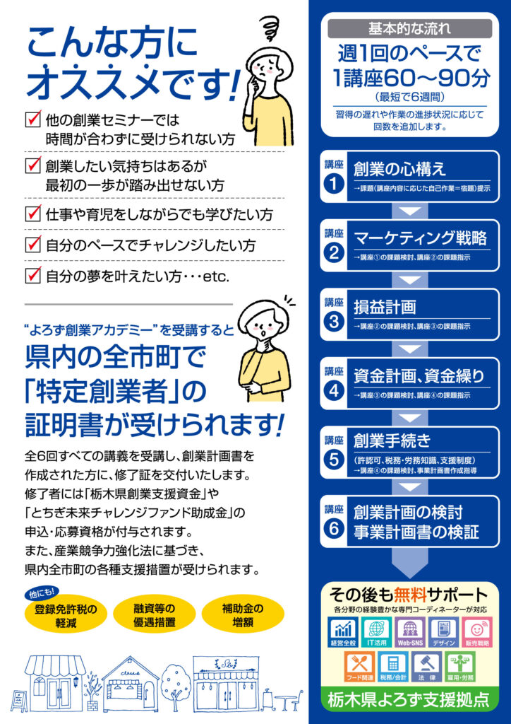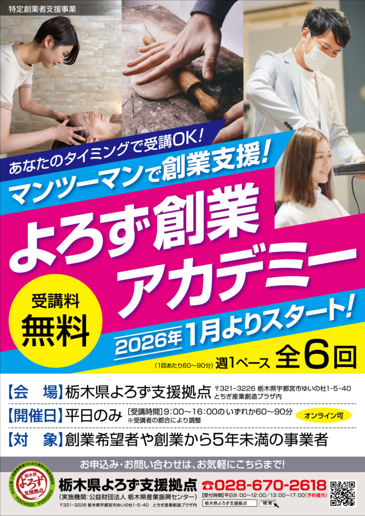 栃木県よろず支援拠点では、県内自治体および商工会議所・商工会の行う特定創業者支援事業を補完し、適切な創業ノウハウを有する特定創業者の「創出」を県内横断的にサポートする個別創業支援講座「よろず創業アカデミー」を令和8年1月より実施いたします。